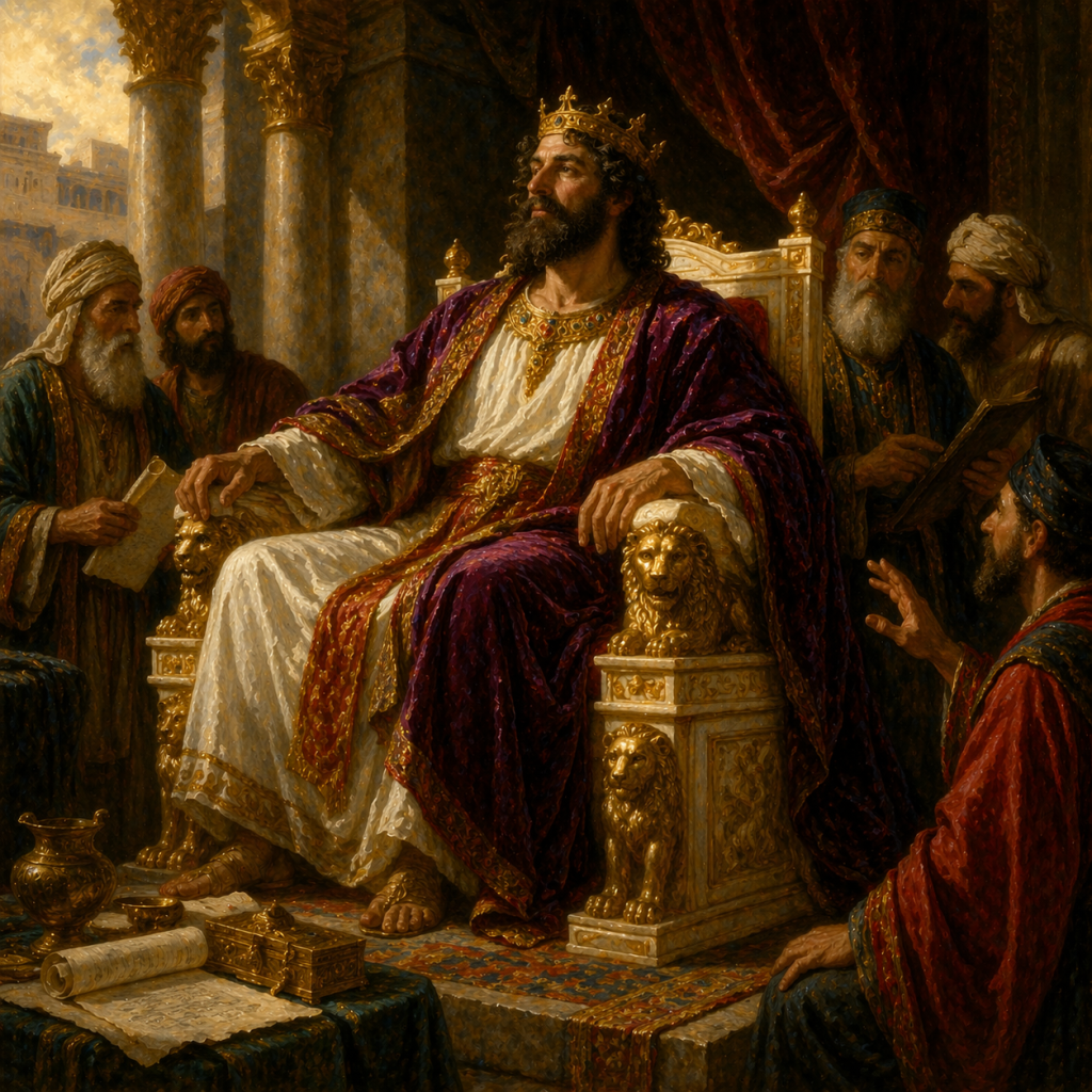 Hadiah mengalir dua arah, dan kapal-kapal Salomo berlayar ke Ofir, membawa pulang emas yang berlimpah. Takhta dari gading berlapis emas murni, dengan enam anak tangga dan patung singa di sisi-sisinya, menjadi simbol kekuasaan yang membuat seluruh dunia memperhatikan Israel.