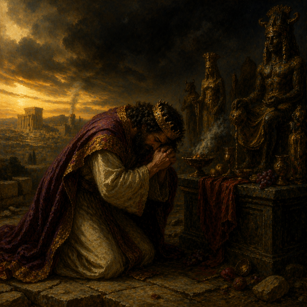 Saat usianya semakin tua, pengaruh mereka perlahan membelokkan hatinya. Kejahatan Salomo mencapai puncaknya ketika ia membangun tempat-tempat tinggi (kuil berhala) bagi dewa-dewa asing seperti Asytoret, Kamos, dan Molokh, yaitu dewa yang menuntut pengorbanan anak. Sang pembangun Bait Suci kini menjadi penyokong penyembahan berhala tepat di depan mata TUHAN. 1 Raja-raja 11:1–8