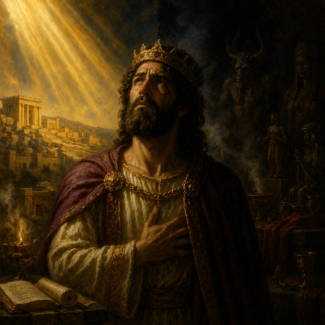 Rakyat langsung menagih janji keringanan pajak kepada anaknya, Rehabeam. Kerajaan yang pernah bersatu damai itu terbelah menjadi dua: Yehuda di selatan dan Israel di utara. Fondasi emas itu runtuh karena hati sang raja telah lama retak. 1 Raja-raja 11:9–13 · 1 Raja-raja 11:14–40 · 1 Raja-raja 12:16