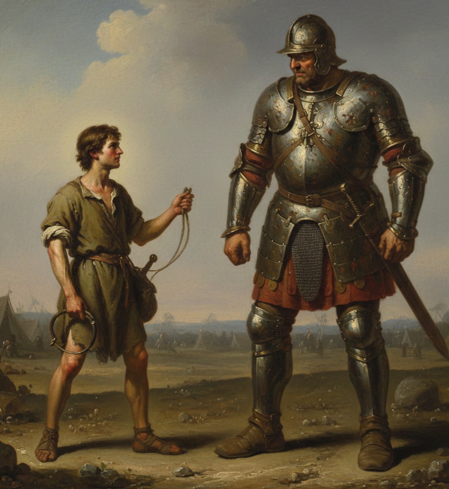 Daud datang ke medan perang hanya untuk mengantarkan bekal bagi kakak-kakaknya. Dia mendengar tantangan Goliat dan melihat ketakutan di wajah para tentara.