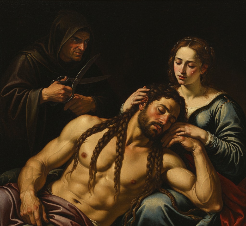 Delila menidurkan Simson di pangkuannya, dan seorang laki-laki mencukur ketujuh kepangan rambutnya. Ketika Delila berteriak “Orang Filistin menyergap engkau, Simson!”, ia bangun dengan percaya diri dan berkata dalam hatinya: “Seperti yang sudah-sudah juga, aku akan dapat melepaskan diri.”