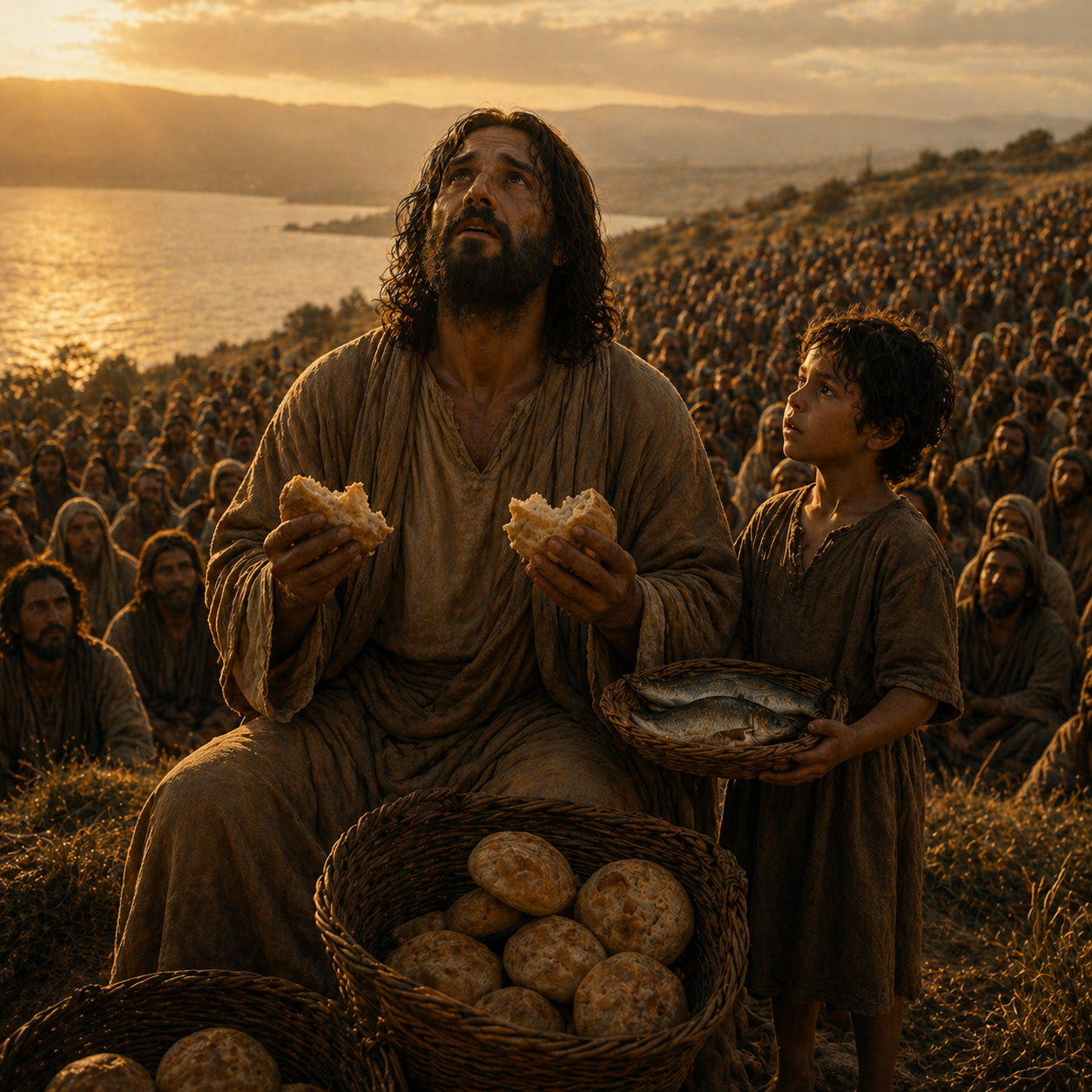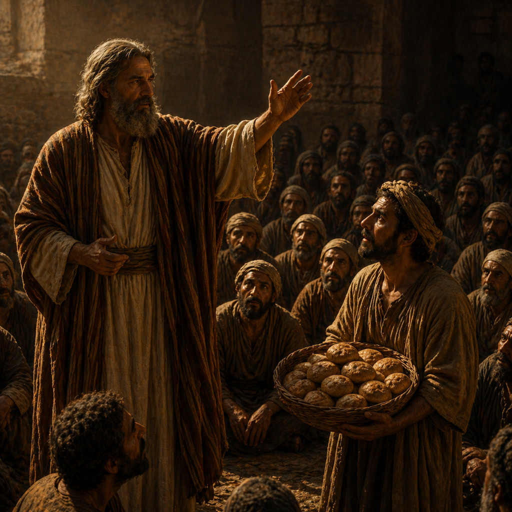 Dengan lima roti jelai dan dua ikan kecil milik seorang anak, Yesus memerintahkan orang-orang duduk. Setelah mengucap syukur, Ia membagi-bagikan roti dan ikan itu. Semua orang makan sampai kenyang. Yang menakjubkan, sisa roti yang dikumpulkan para murid mencapai dua belas bakul penuh.
