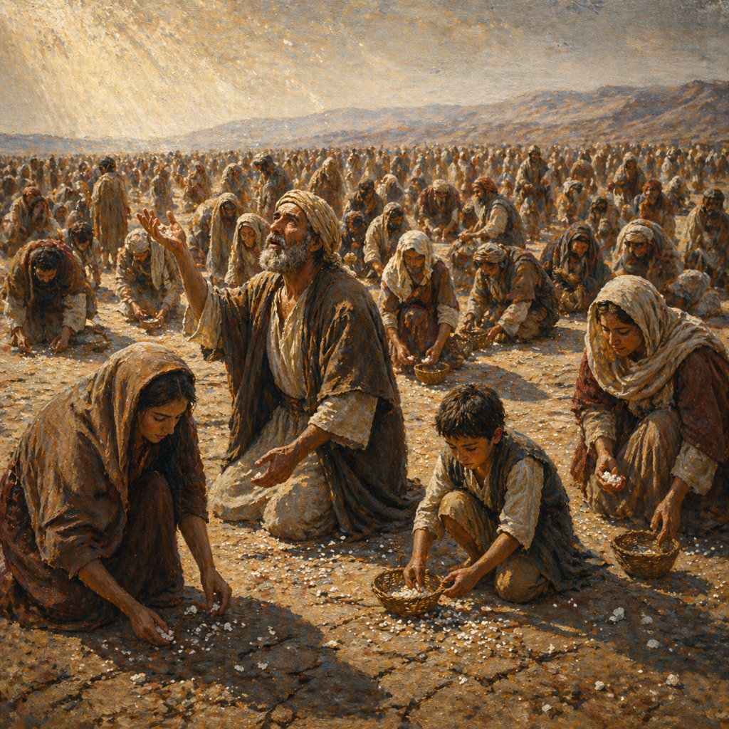 Bayangkan bangsa Israel yang baru keluar dari perbudakan Mesir. Mereka berada di padang gurun yang gersang, tanpa persediaan makanan yang memadai. Di situlahAllah menurunkan manna setiap pagi, makanan surgawi yang cukup untuk setiap hari (Keluaran 16:1–36).