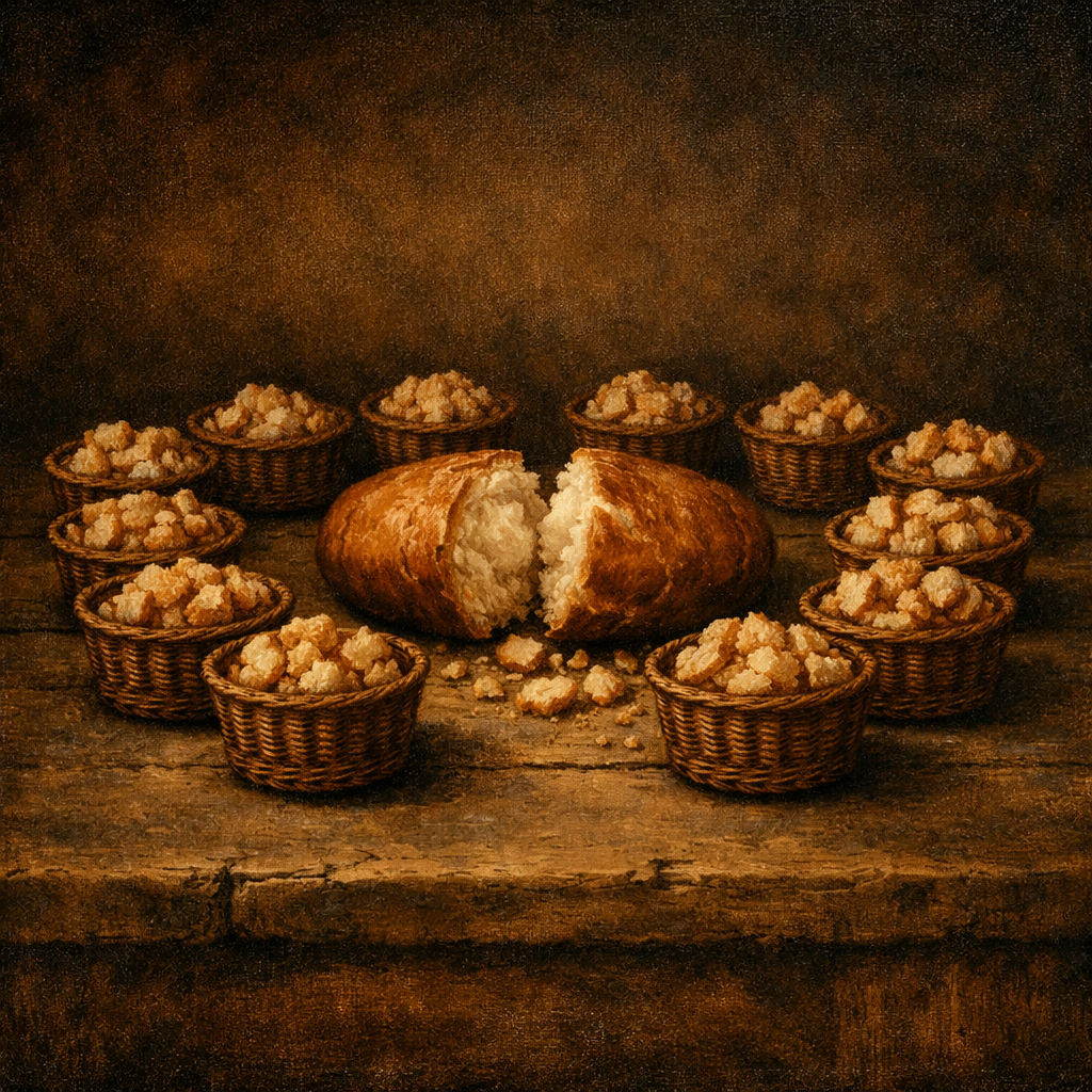 Dua belas bakul sisa roti mendapatkan makna yang lebih kaya dalam konteks ini. Bukan hanya bukti kelimpahan, melainkan lambang hasil penyaringan. Setelah mukjizat dan pengajaran yang keras, yang tersisa bukanlah kerumunan besar, melainkan kelompok kecil yang setia. Dua belas bakul itu mengingatkan pada dua belas suku Israel dan dua belas rasul. Dari banyaknya orang yang datang karena roti, hanya sedikit yang tinggal karena Kristus.
