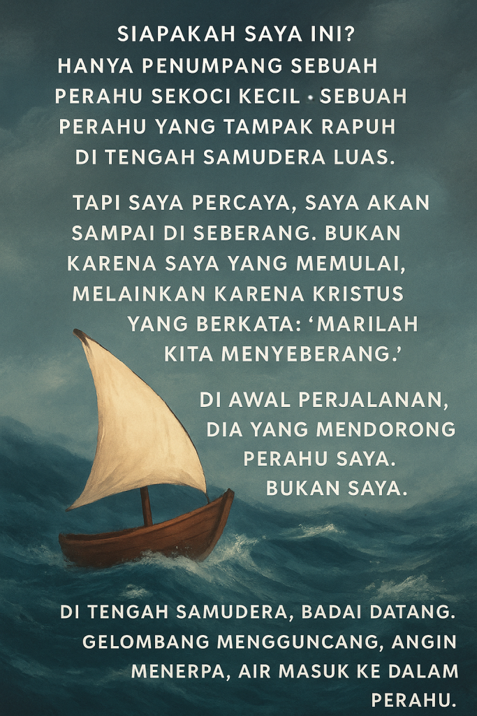 Perahu sekoci kecil ini akan sampai, bukan karena kekuatan kita, tetapi karena Dia yang ada di dalamnya. Kristus yang memulai, mengantar, dan menyelesaikan perjalanan iman kita. 🙏